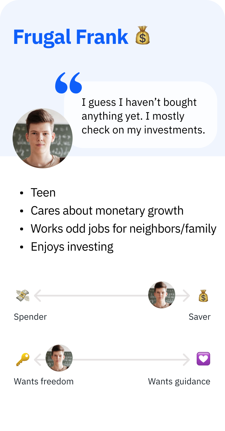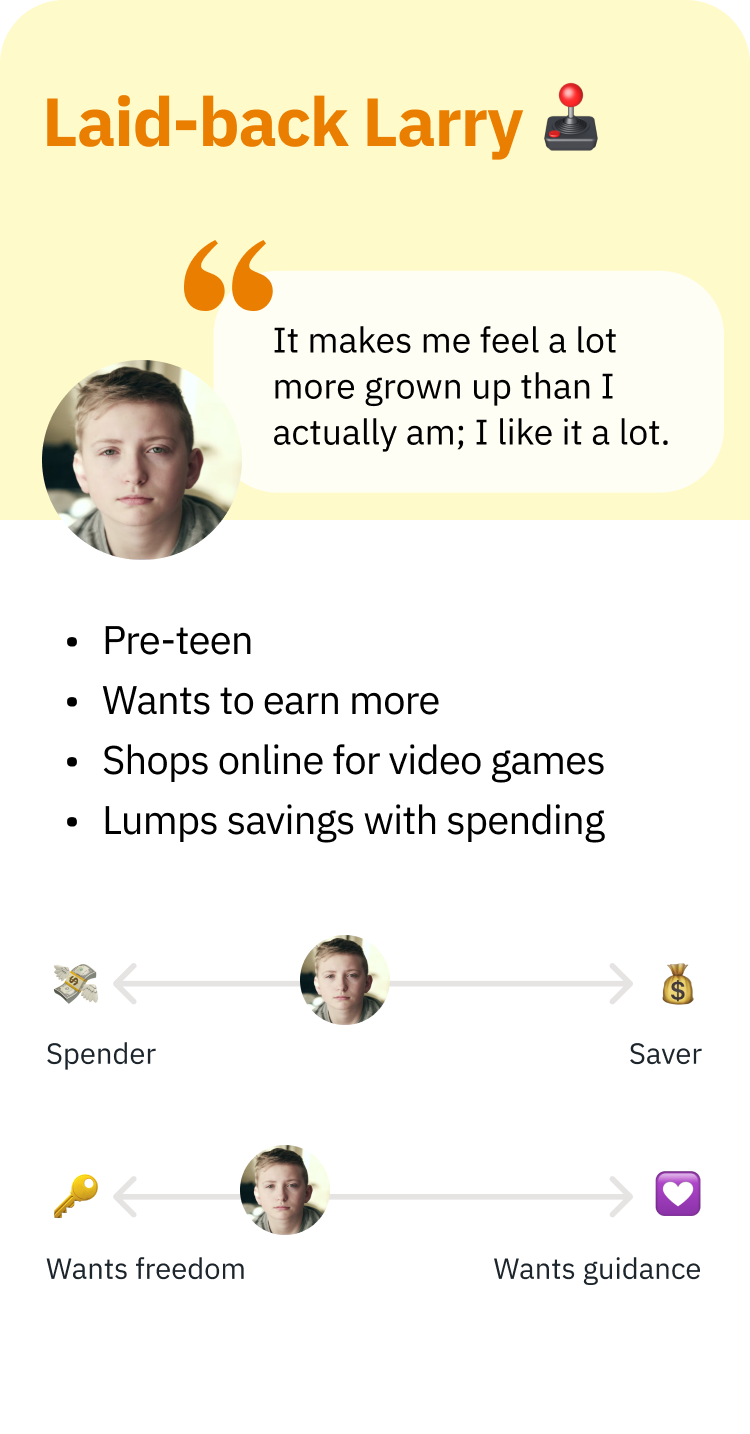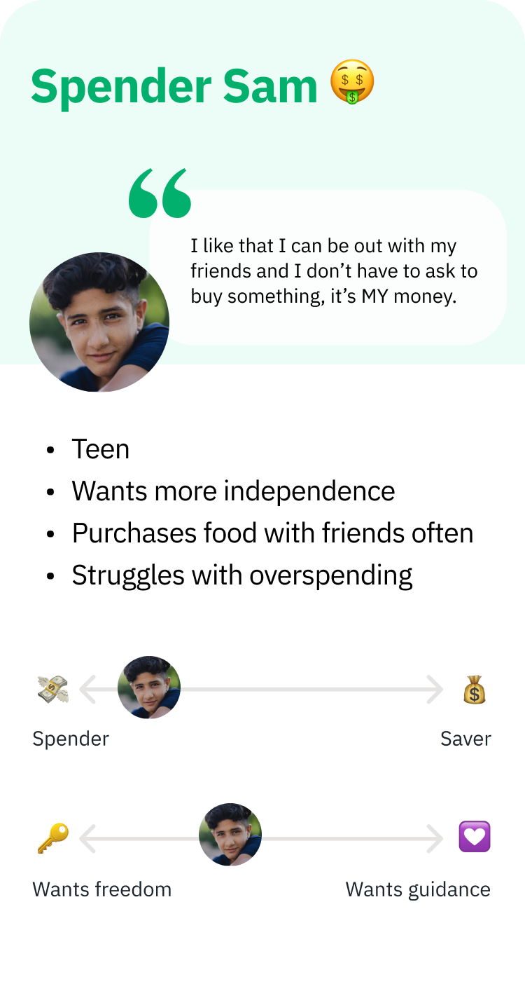 During my first few years at Greenlight, I became committed to learning our customers’ wants and needs. I noticed a lack of alignment on what users to target when developing new product initiatives. After interviewing 11 parents & kids (Ages 11-15) who had recently joined GL, I crafted 4 qualitative personas from the data collected to serve as a source of truth when designing for Greenlight kids.