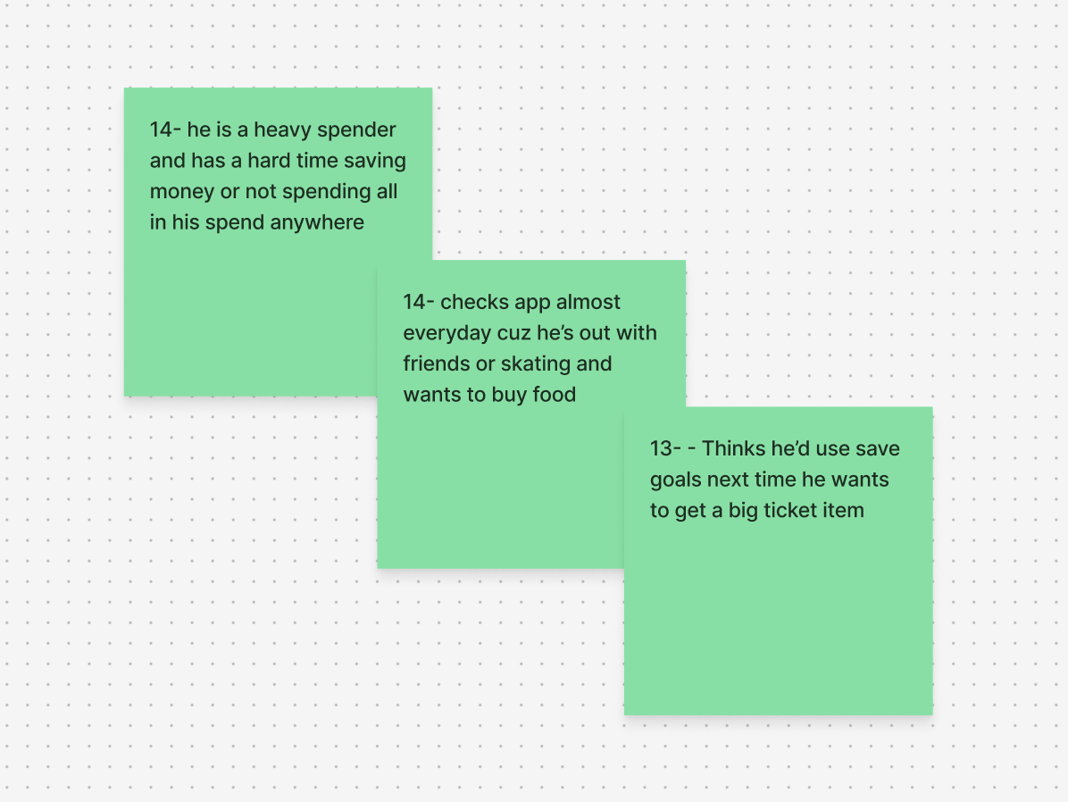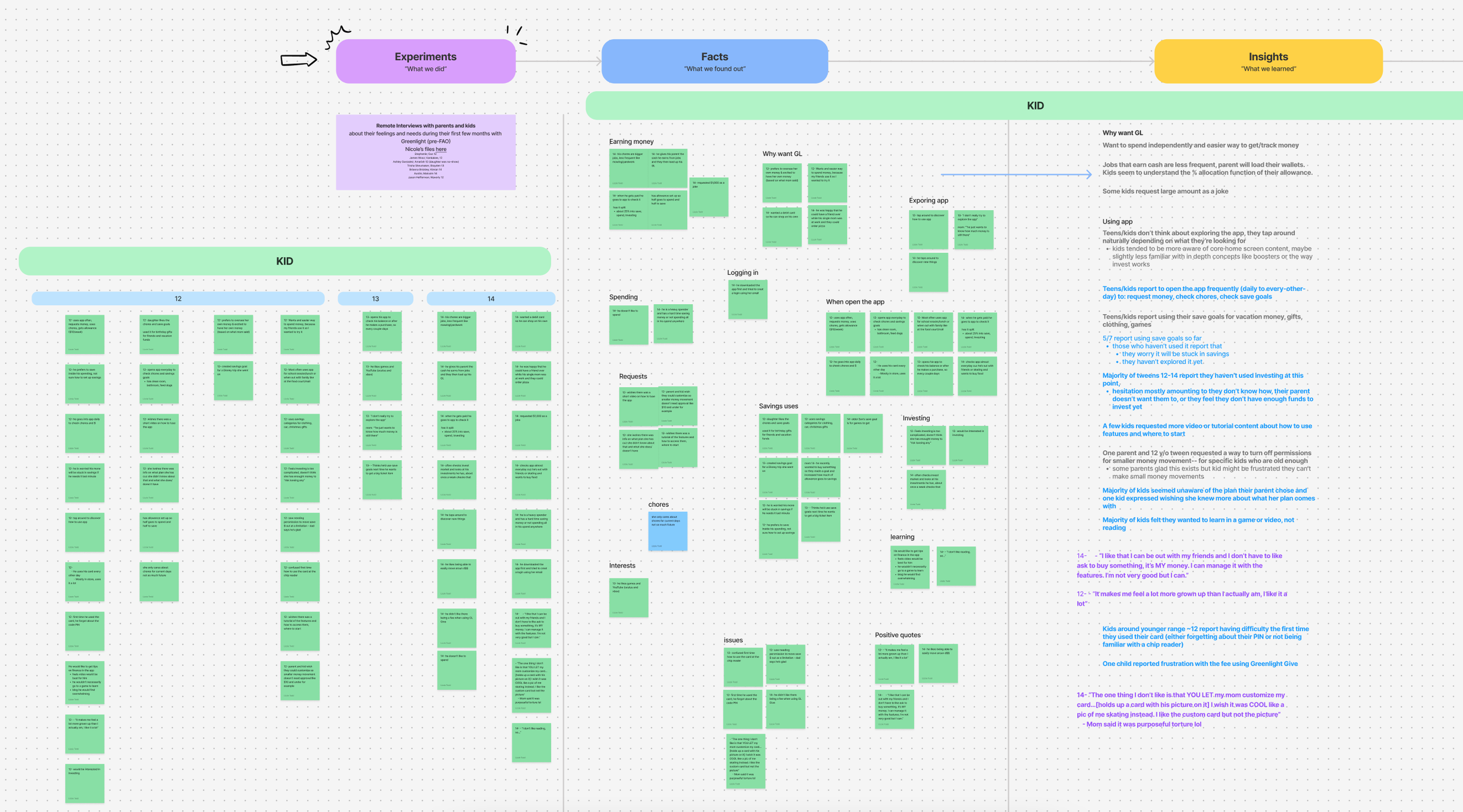 From that, I pulled facts based on the research such as Kids’ perceptions of Greenlight, their goals, or pain points. From the facts gathered, we could glean broader insights and takeaways.