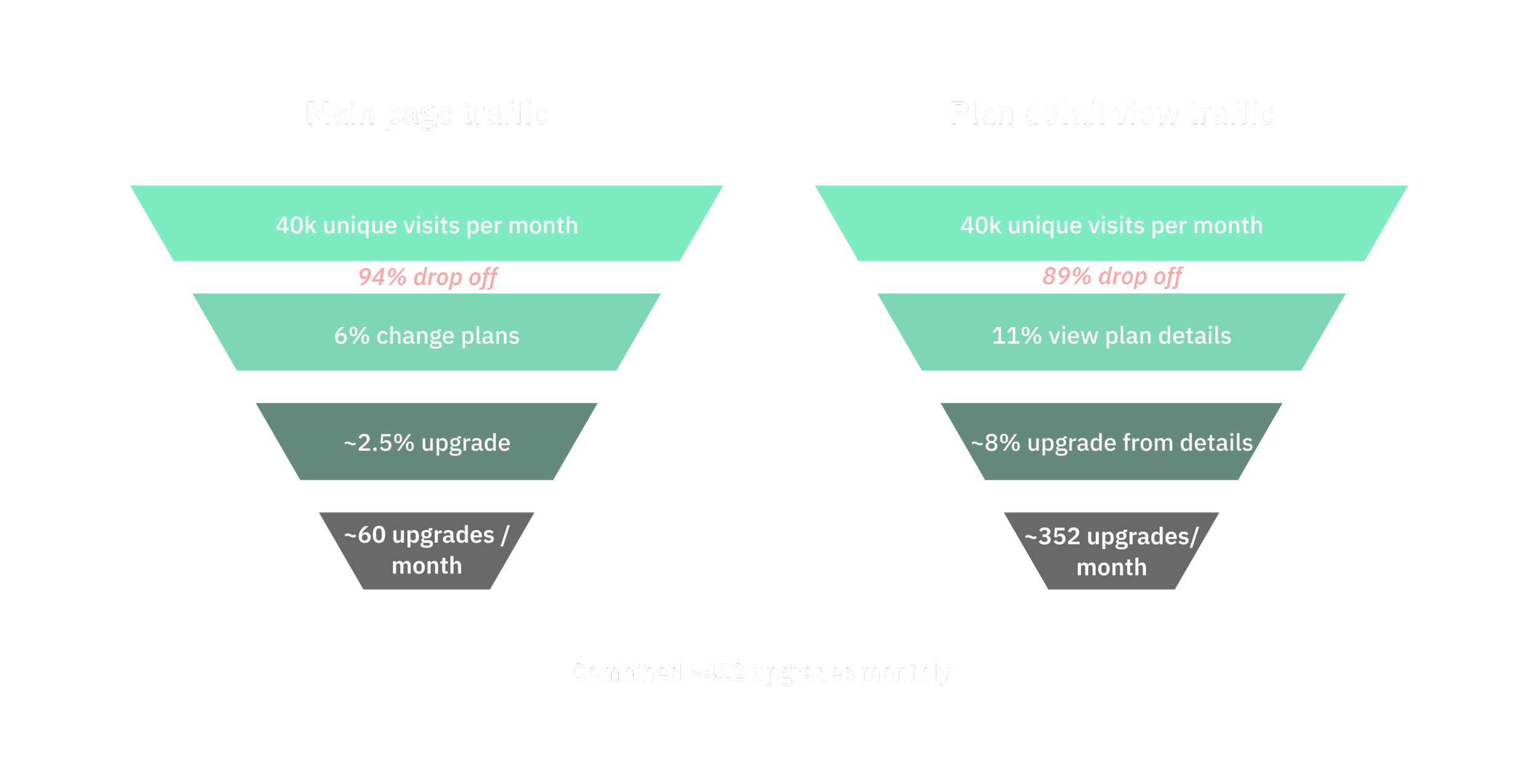 At the time, the plans page got 40k unique visits per month. Only ~6% made a plan change, which were equally split between upgrades and downgrades.
