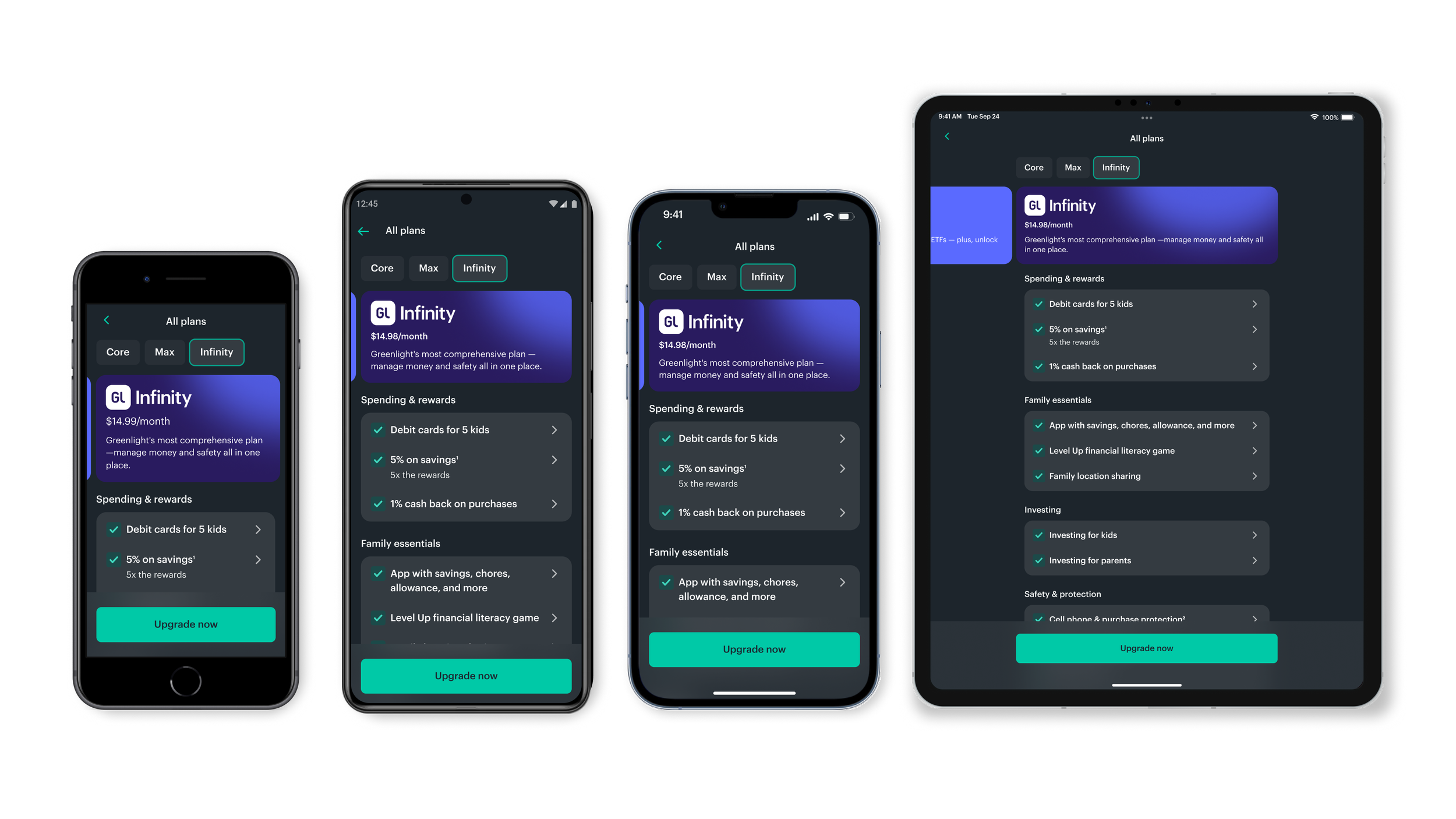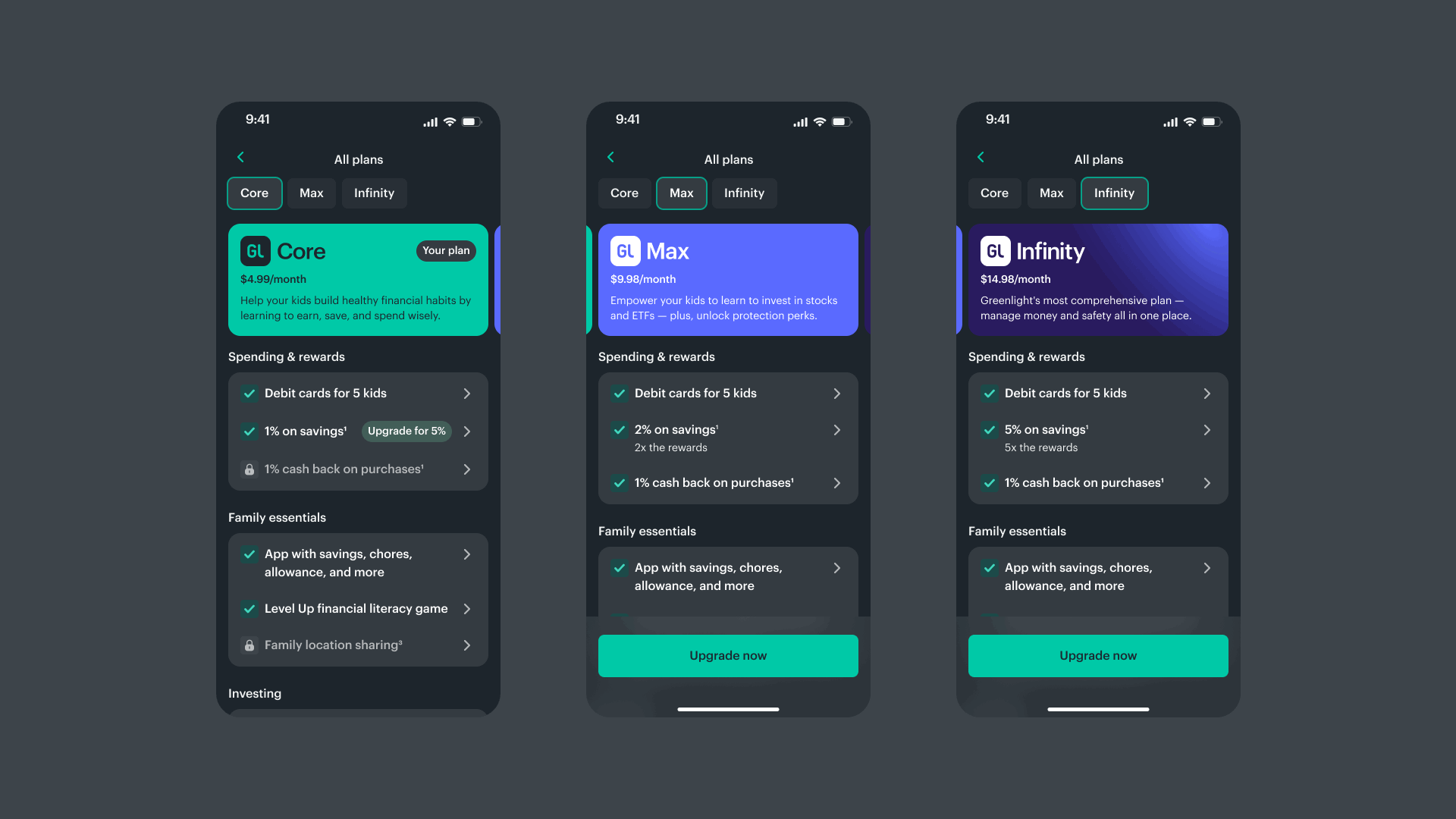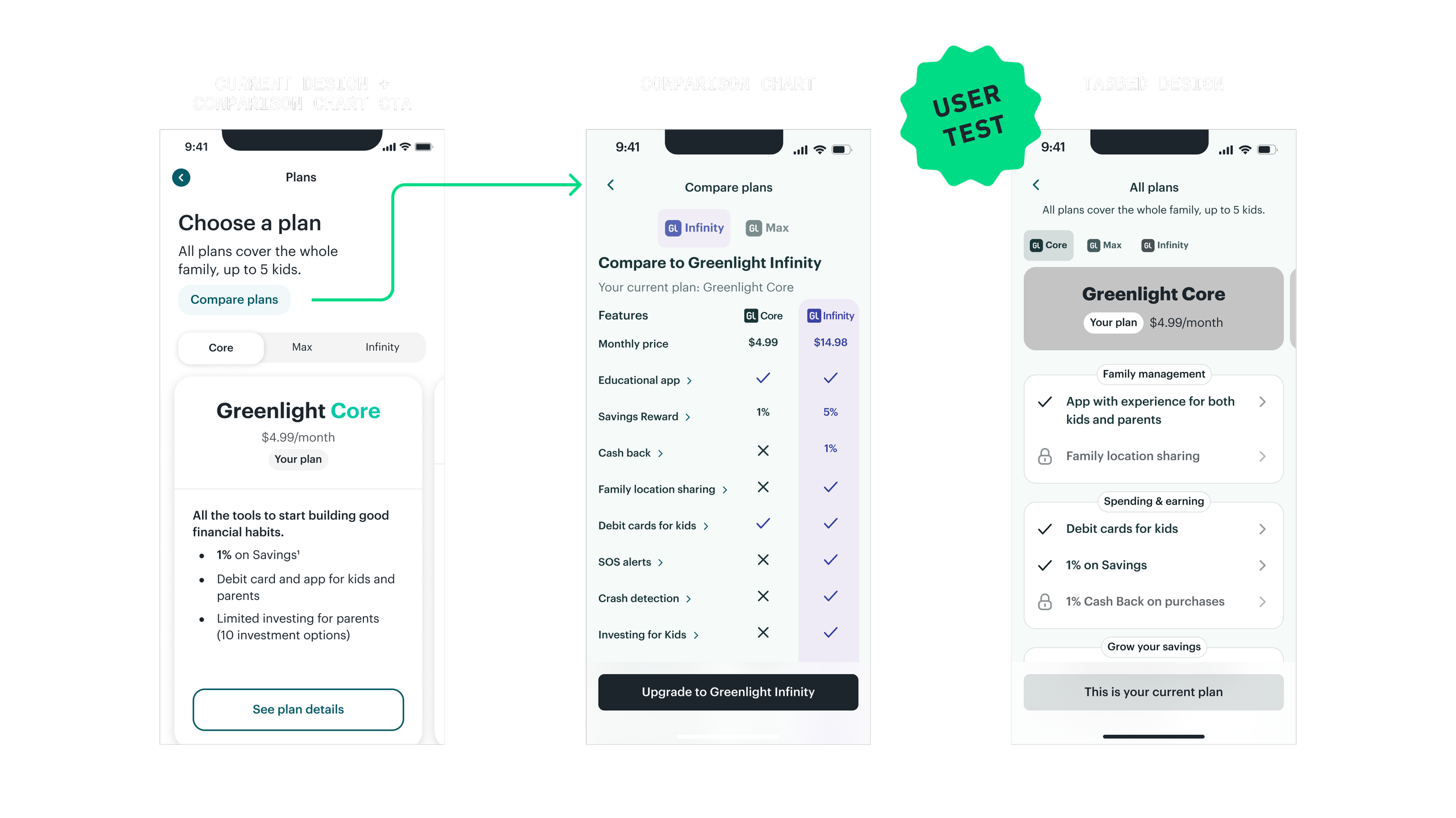 Greenlight had growing plans to choose from with features ranging from debit cards and investing, all the way to safety features for the entire family. I redesigned the in-app plans page, with my PM partners, to scale for additional plans, increase upgrades, and improve the comparison experience.