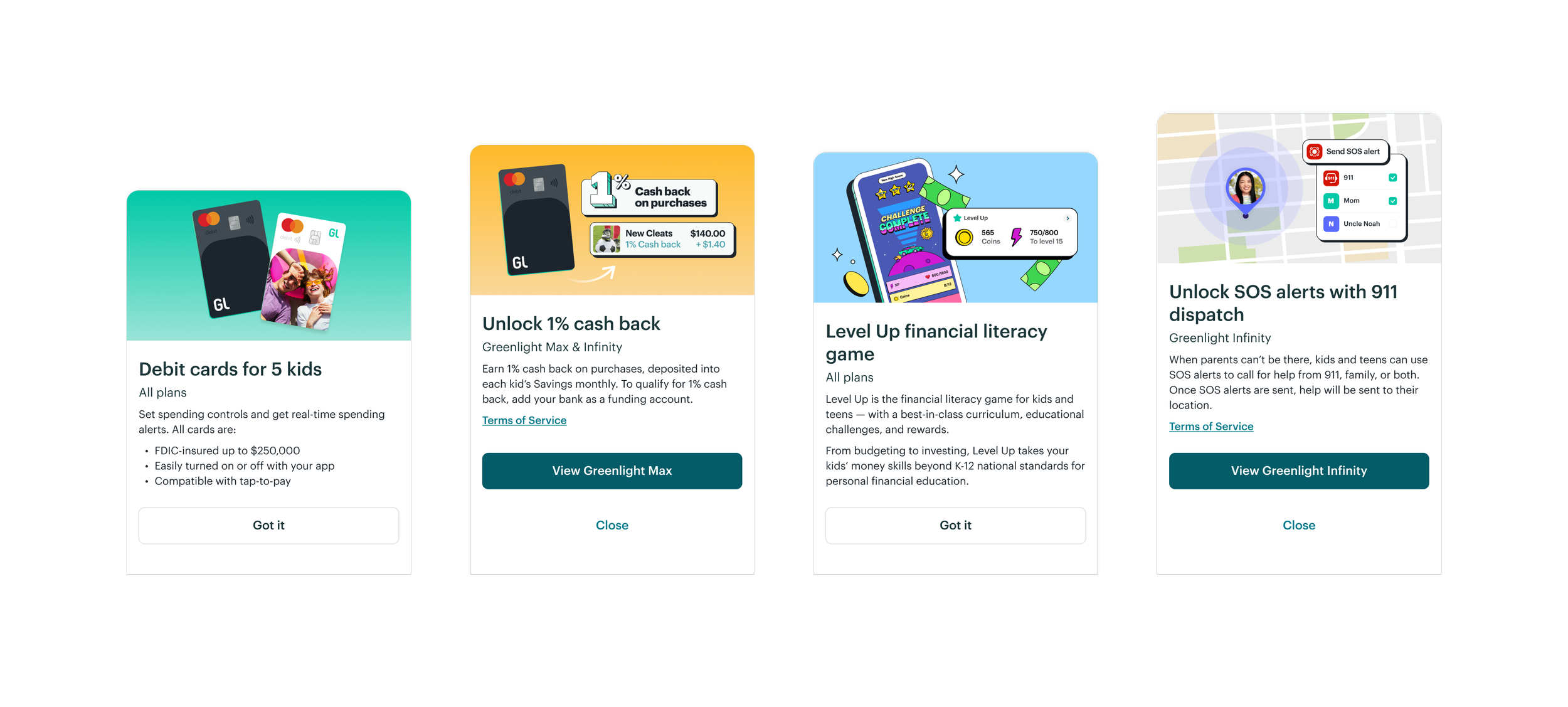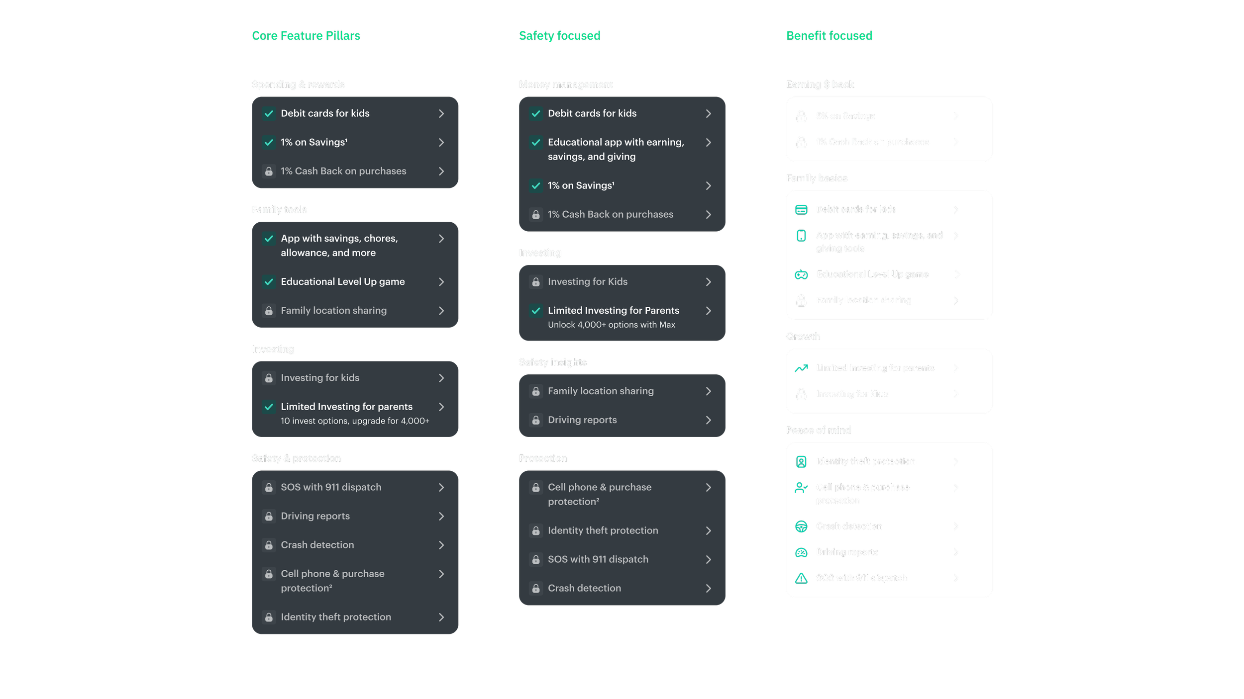 With a successful interaction pattern established, I turned my focus to copy writing and ways to categorize features. I landed on grouping features that aligned with the main pillars of Greenlight’s business; “Spending & Rewards”, “Family Essentials”, “Investing”, and “Safety & Protection”. This also grouped features according to the key value or service they provided, making it easier to understand.