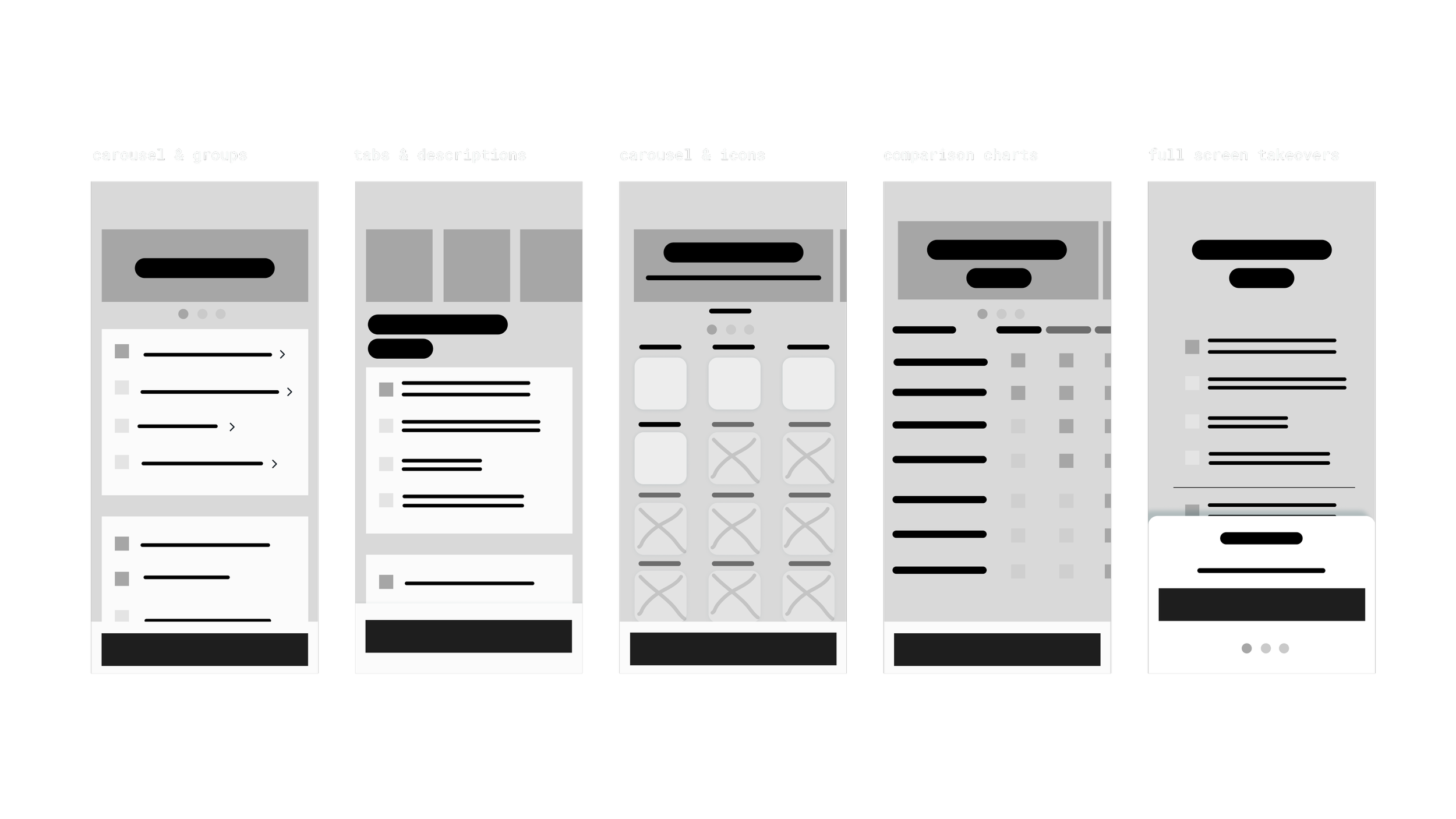 After auditing various interaction patterns across similar industries and digital products, I had enough information to explore low-fidelity designs. I generated several lo-fi wireframes to compare and contrast different layouts, lists, and feature detail views. From this exploration, I learned that tabs or a navigation that highlights how many plans we have (in addition to larger cards or a carousel) would increase higher plan awareness.